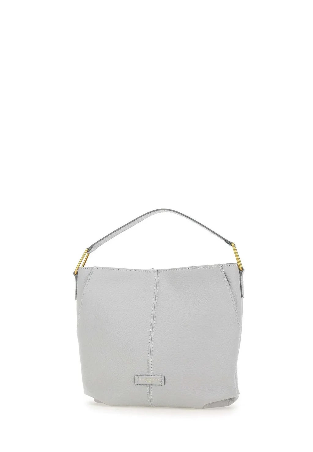 A simple grey bucket bag with a single handle and gold-toned hardware accents. The bag has a soft, unstructured shape and a central seam detail on the front.