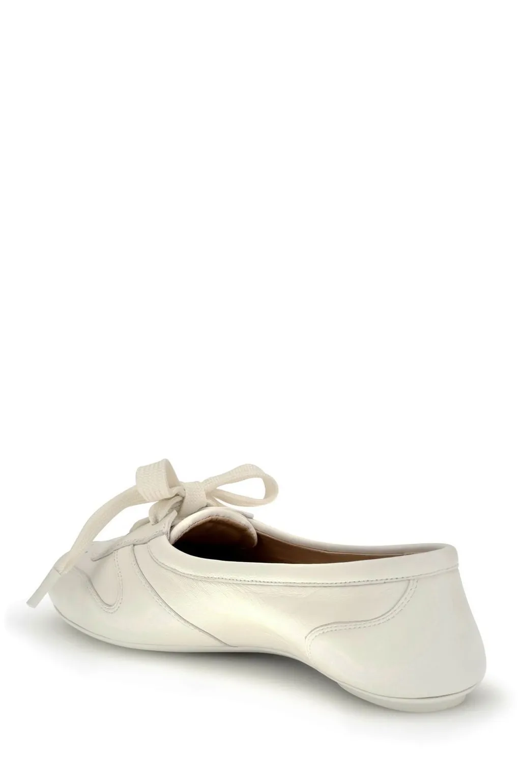 White leather ballet flats with a rounded toe and a lace-up closure. The toe box features perforated detailing. A bow is tied at the top of the laces.