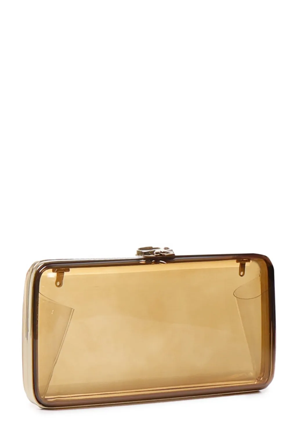 A rectangular box clutch with a clear, amber-toned acrylic body and a metallic clasp closure. It features a delicate, silver-toned chain strap.