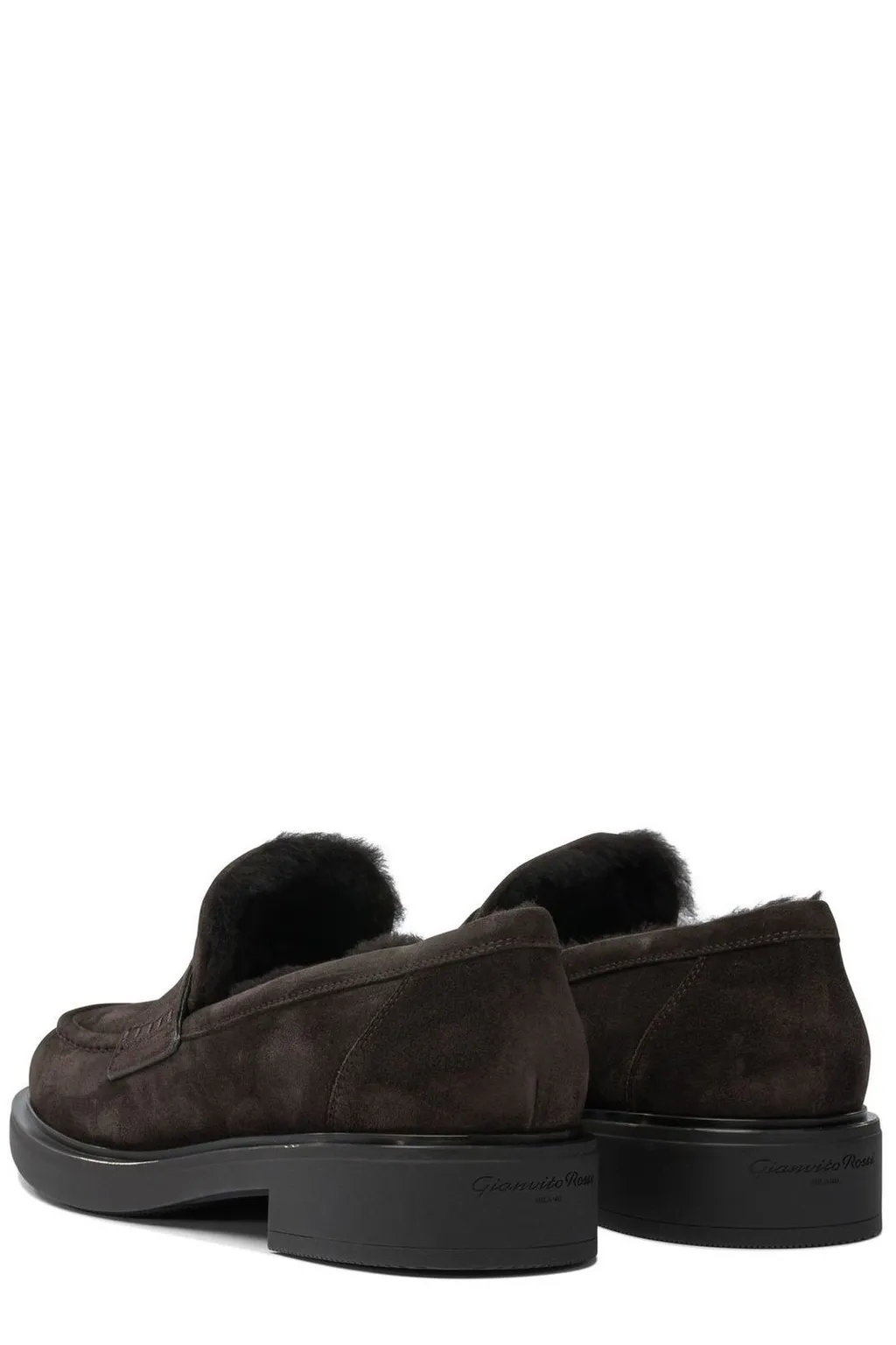DescriptionThese loafers feature a classic penny loafer silhouette crafted from dark brown suede. They are lined with plush, warm fur for added comfort and warmth, making them ideal for cooler weather. The shoe has a rounded toe and a thick, durable black sole.