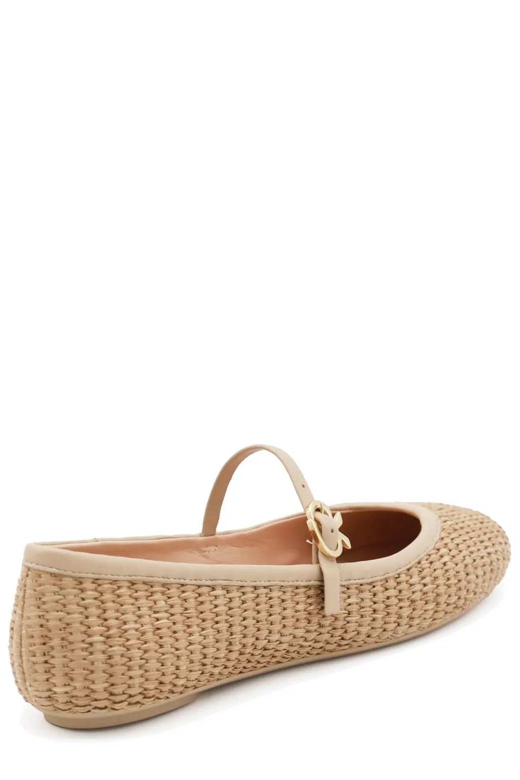Round-toe ballet flats with a woven straw-like texture. Features a thin ankle strap with a gold-tone buckle closure. The sole and lining appear to be a neutral leather.