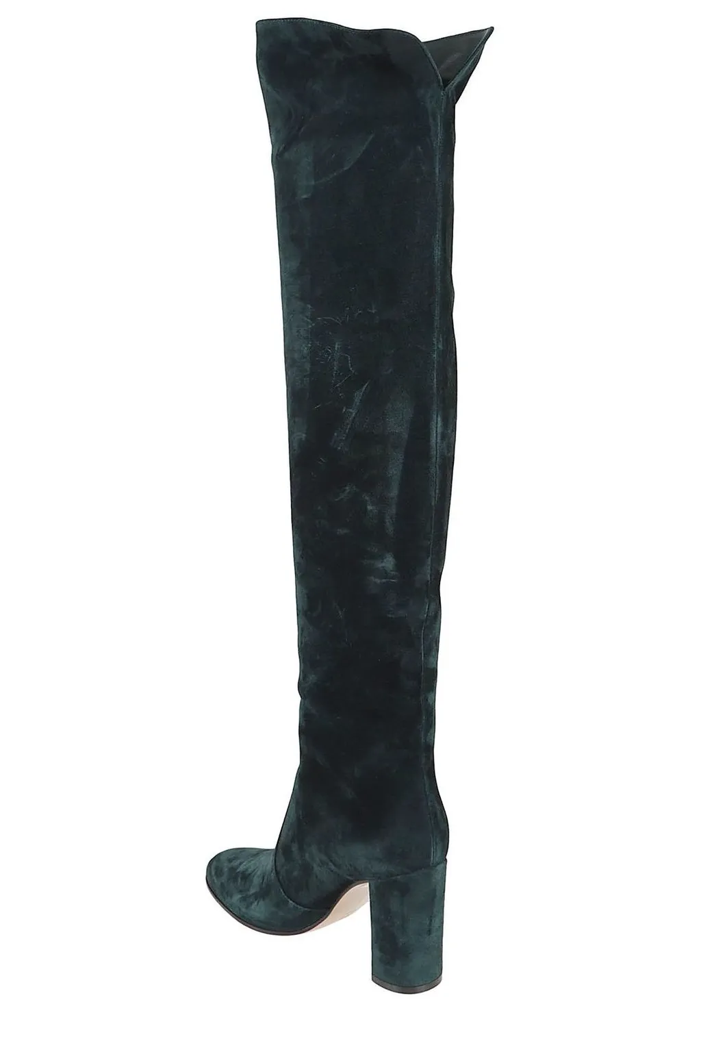 A pair of dark green suede over-the-knee boots with a block heel and a pointed toe.