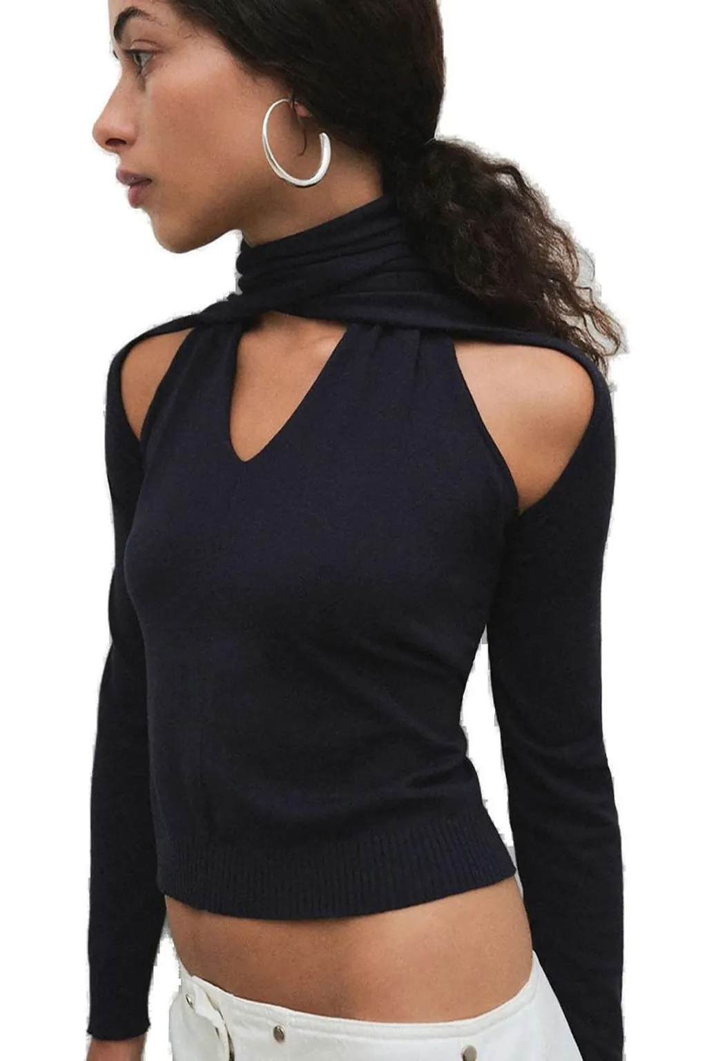 A long-sleeved knit top with a halter neckline and cut-out details at the shoulders. The top features a deep v-neckline and a fitted silhouette. The sleeves are detached and can be worn around the neck or arms.