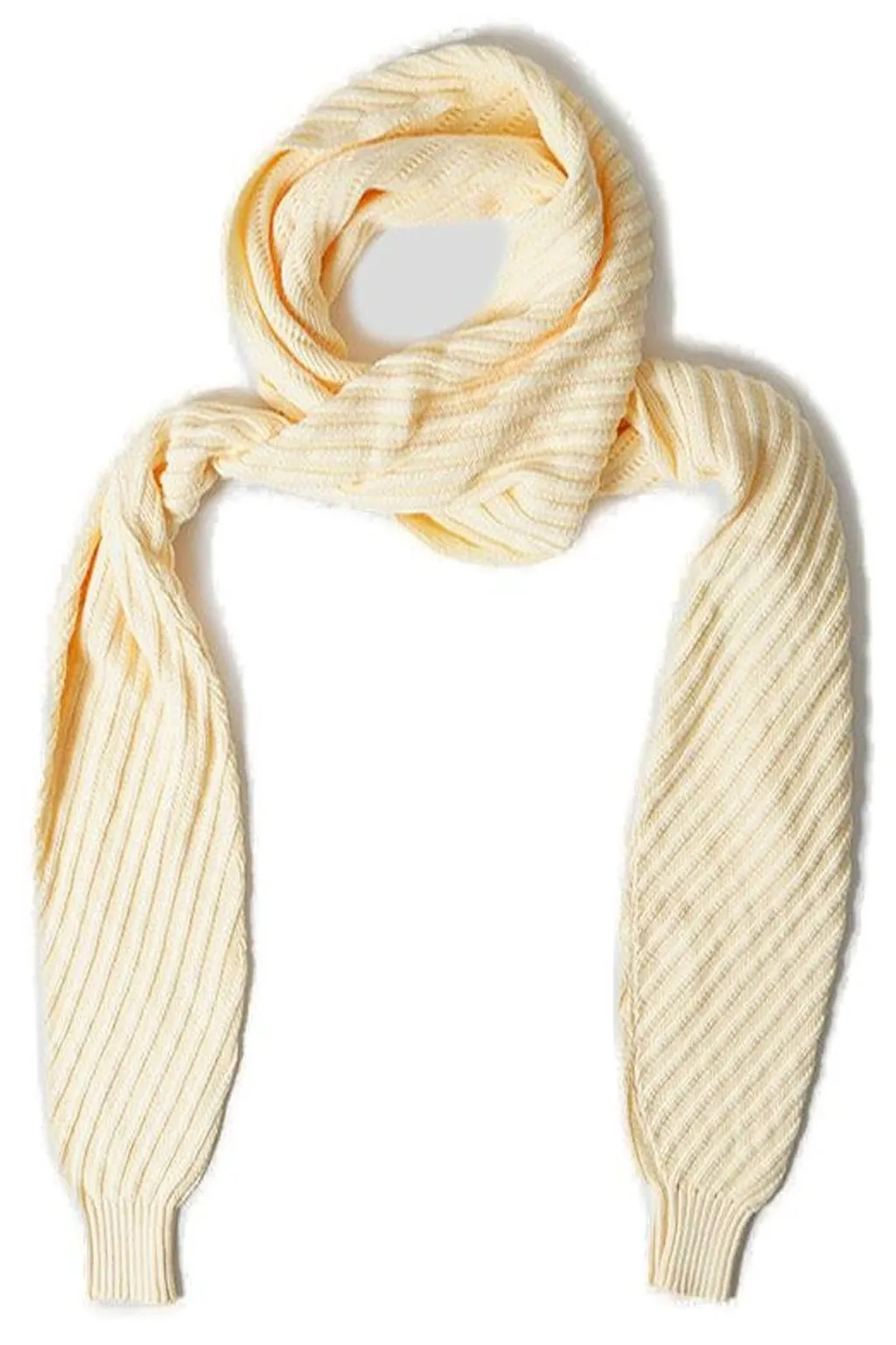A cream-colored knit scarf with integrated sleeves. The scarf features a ribbed texture with diagonal lines and a cuffed finish at the end of each sleeve.