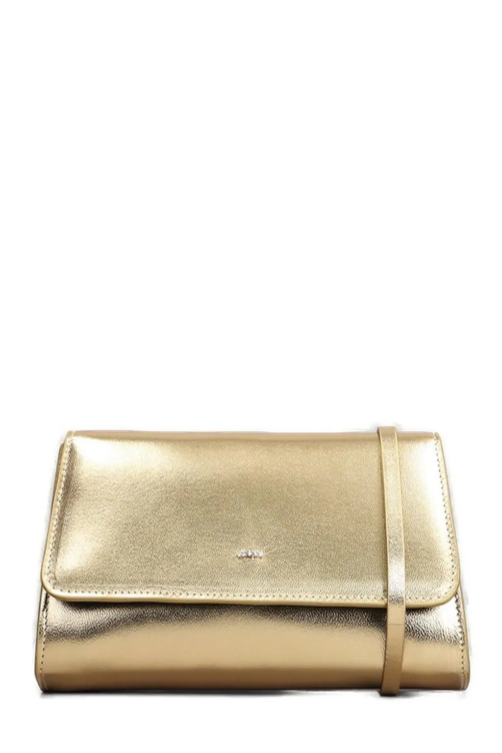 A metallic gold clutch bag with a flap closure and a thin shoulder strap. The bag features a small, subtle embellishment on the front flap.