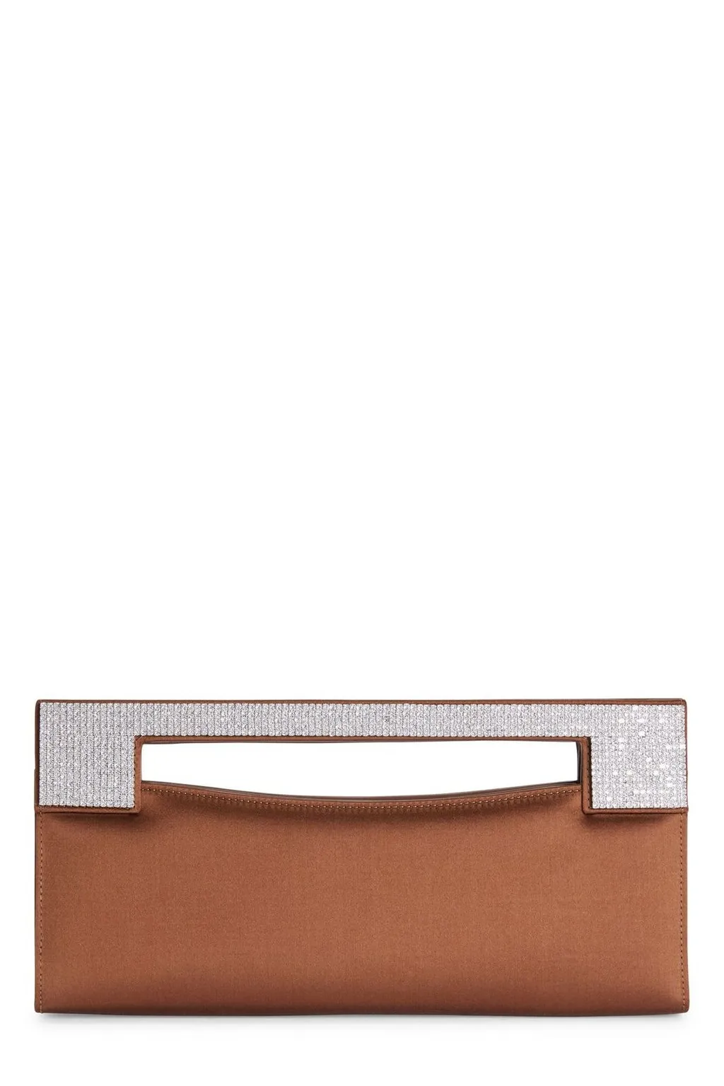 A rectangular clutch bag with a top handle. The handle is embellished with rhinestones. The bag is made of a satin-like material.