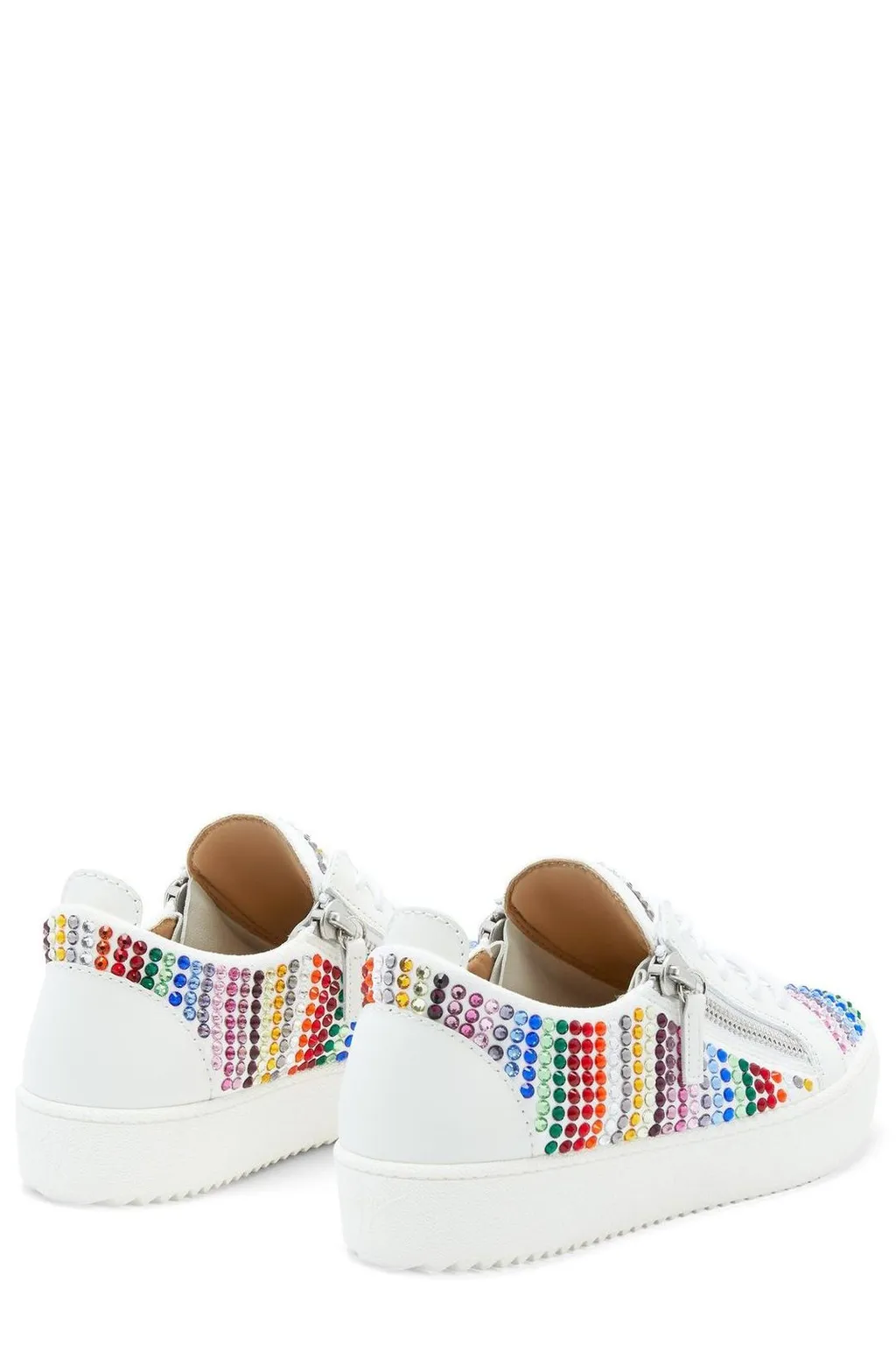 White leather low-top sneakers embellished with multicolored rhinestones on the toe, side, and heel. Features a lace-up closure, a side zip detail, and a platform sole.