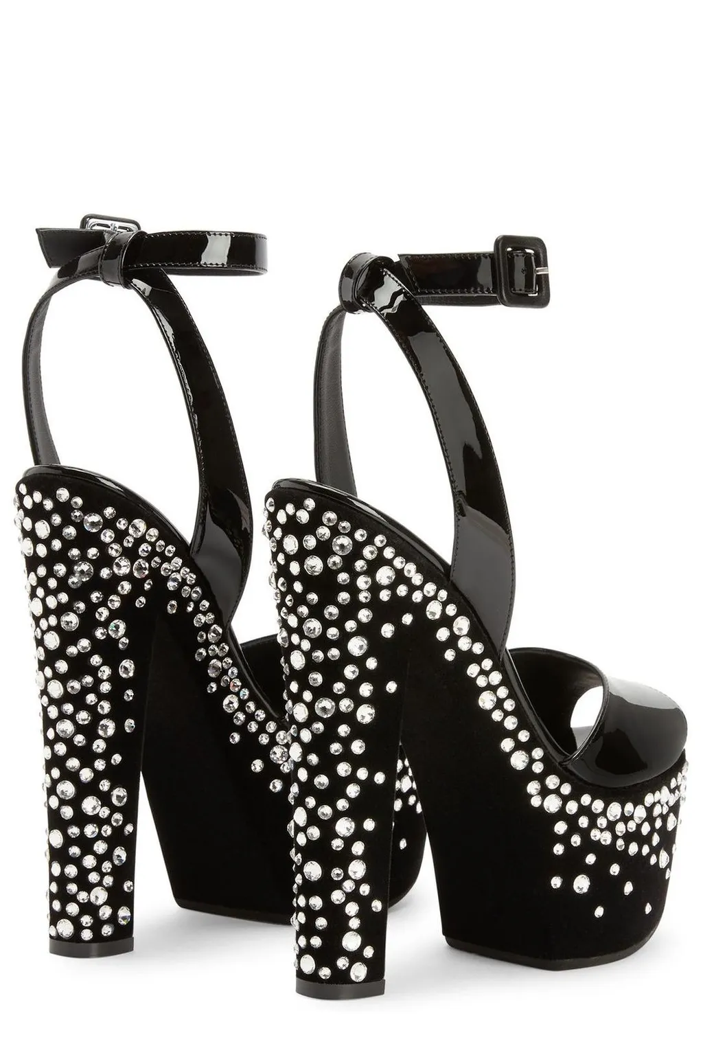 These platform sandals feature a chunky block heel and a thick platform sole. They have an open toe and an ankle strap with a buckle closure. The entire shoe, including the heel and platform, is embellished with rhinestones.