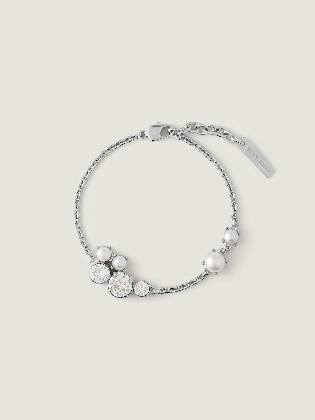 Bracelet in silvery-finish metal with crystals and pearls. Features an adjustment chain with a givenchy engraved metal plaque. Matching necklace, earrings, and ring sold separately.