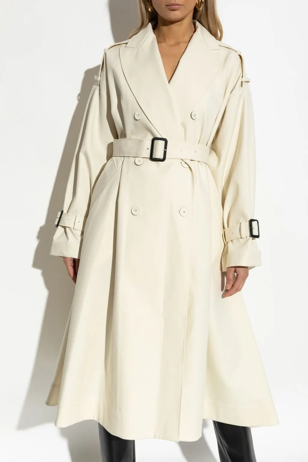 A double-breasted trench coat with a classic collar, epaulets on the shoulders, a belted waist with a black buckle, and adjustable cuffs with buckles. The coat features a flared hemline and button closures.