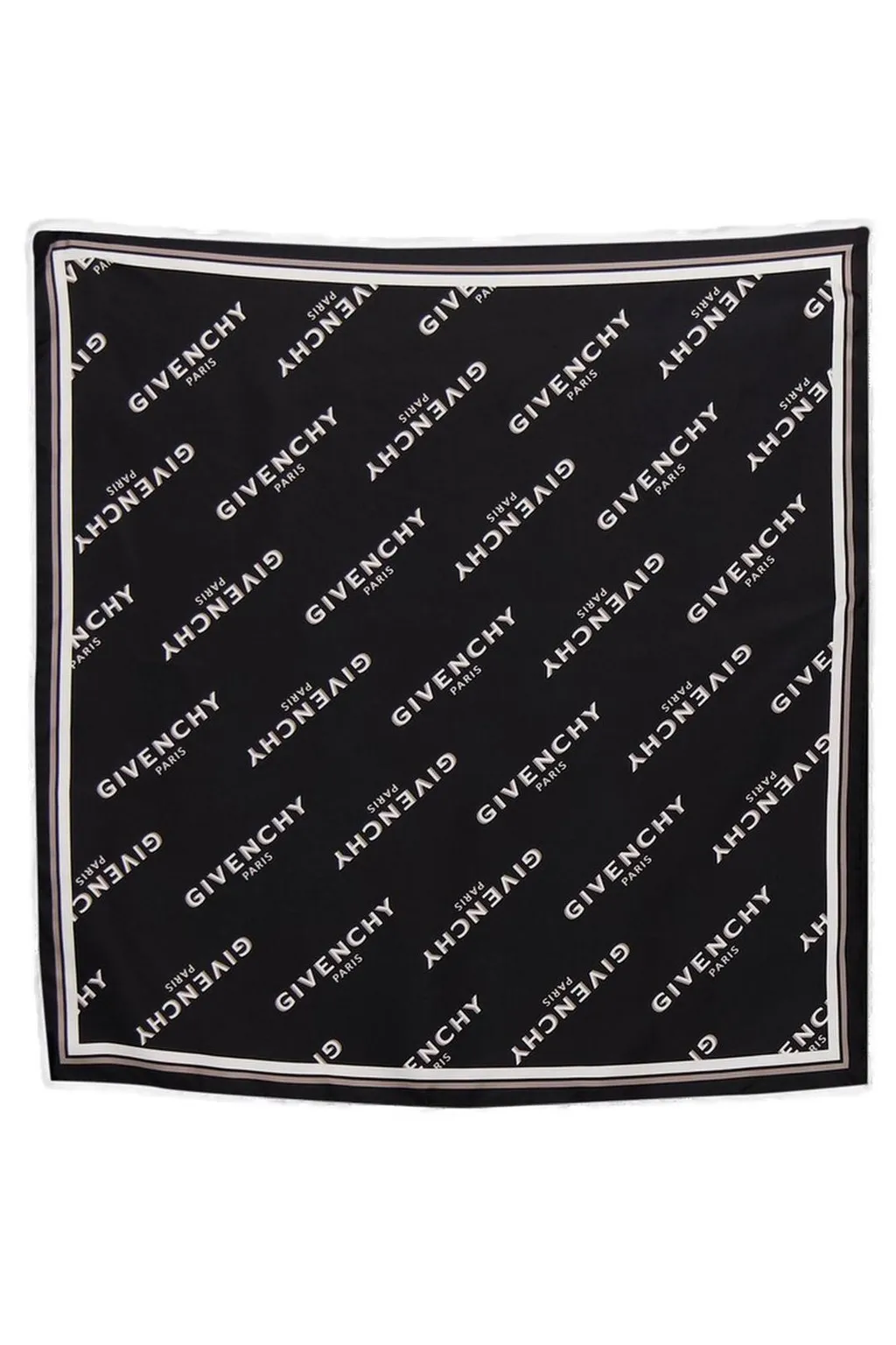 A black silk scarf with a repeating givenchy paris logo pattern in white. It features a thin border with alternating white and beige stripes.