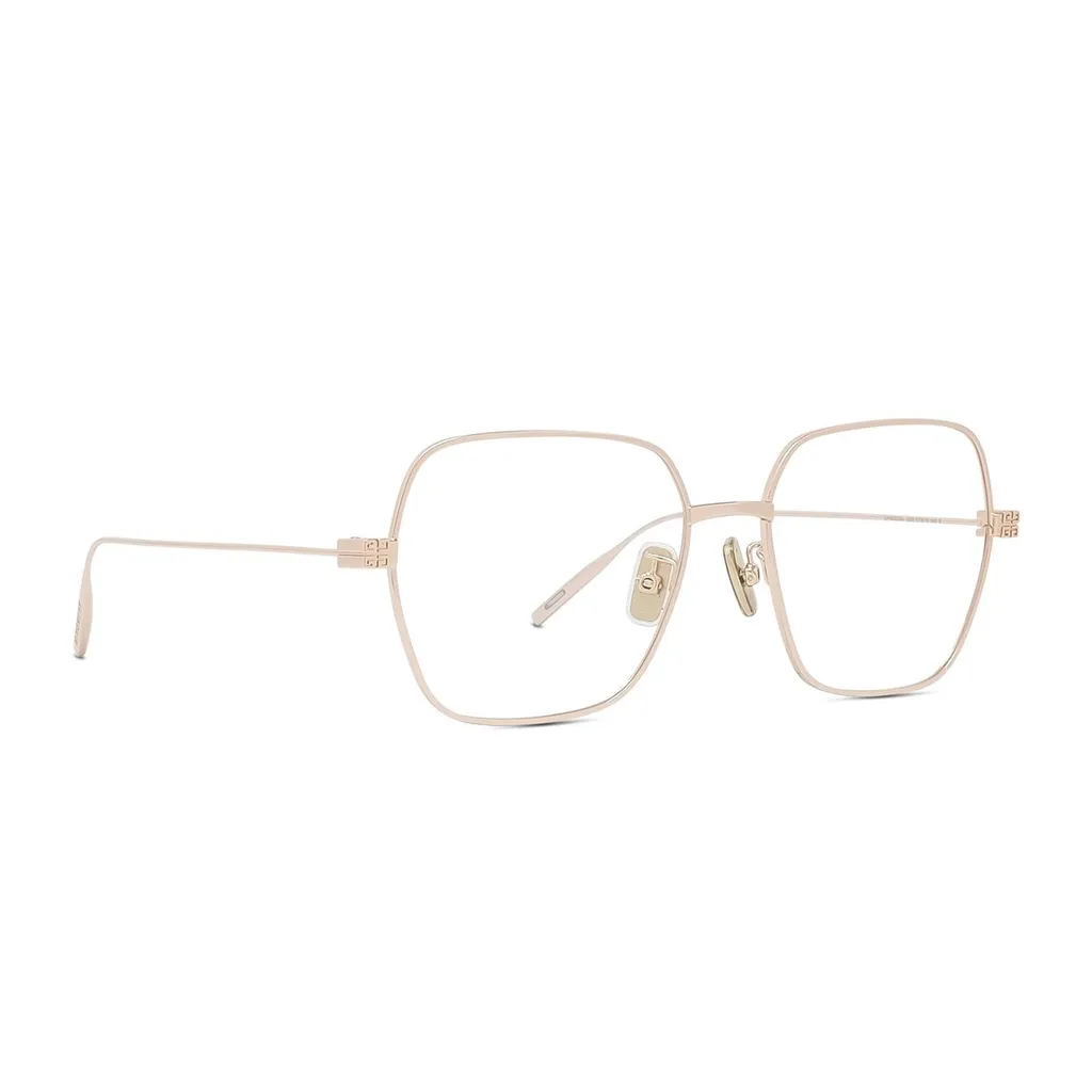 These glasses feature a square frame with a thin gold metal construction. They have adjustable nose pads for comfort and a minimalist design.