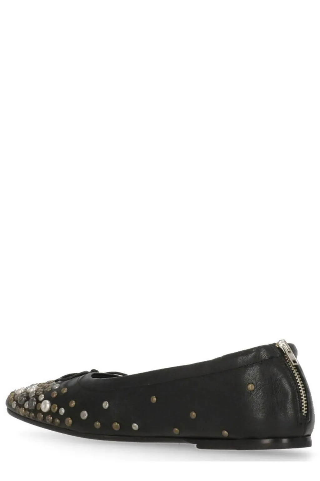 Black leather ballet flats with a rounded toe, embellished with scattered silver and gold-toned studs and crystals. Features a small bow detail at the toe and a subtle heel.