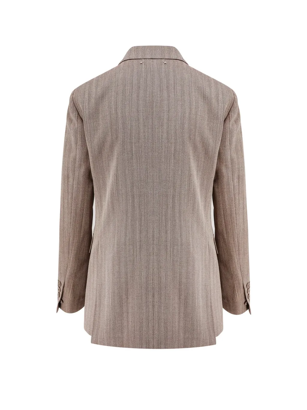 DescriptionA double-breasted blazer with a notched lapel and a single button closure. It features two flap pockets on the front and a subtle pinstripe pattern. A decorative feather brooch is attached to the left lapel. The interior lining has a floral print.
