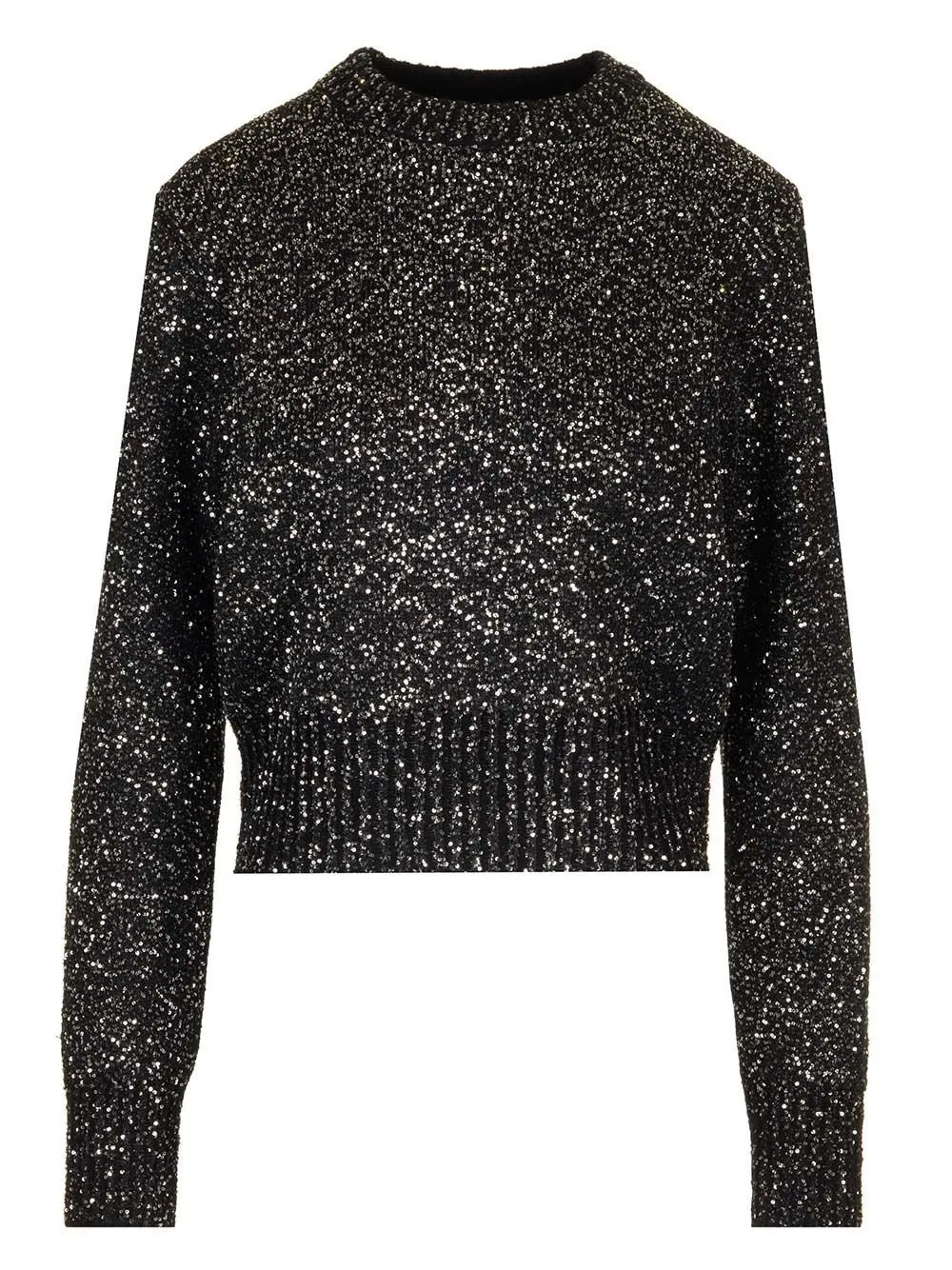 A long-sleeved, crew neck sweater covered in shimmering black and silver sequins. It features a ribbed hem and cuffs, and a slightly cropped silhouette.