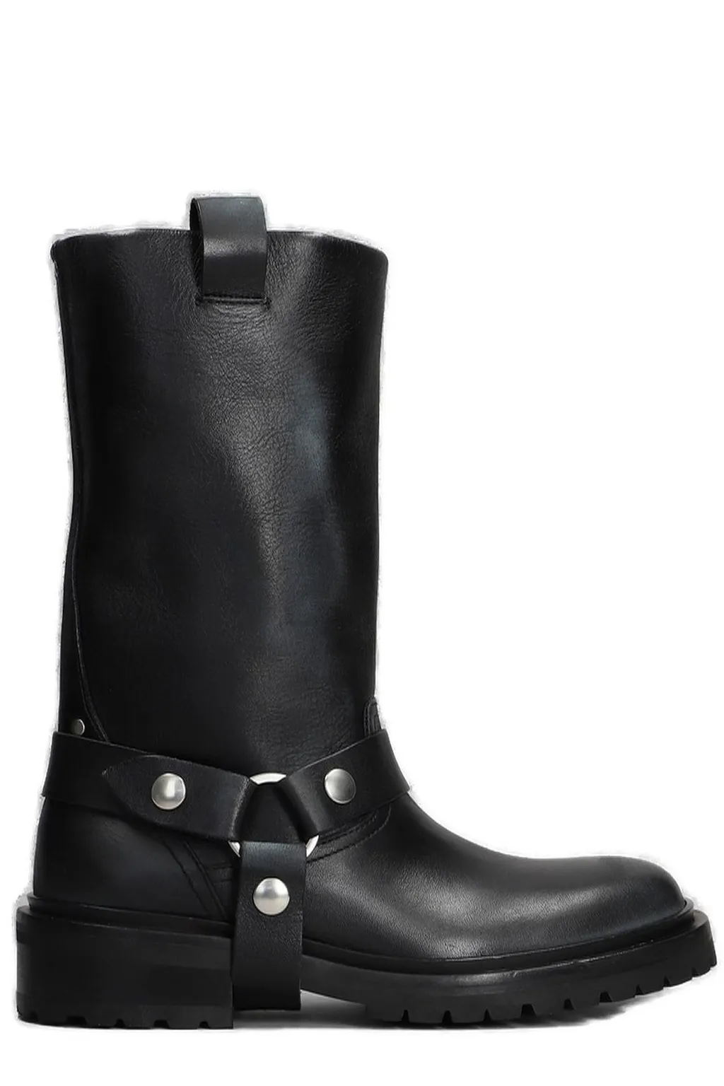 Tall black leather boots with a round toe and a chunky lug sole. Features a harness strap around the ankle with silver-tone hardware and a pull-tab at the top of the shaft.