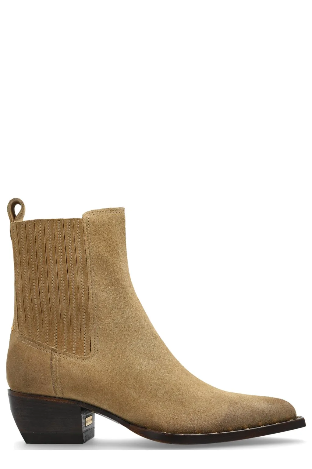 A pair of beige suede western boots with a pointed toe, a cuban heel, and elasticated side panels. The boots feature a pull tab at the back.