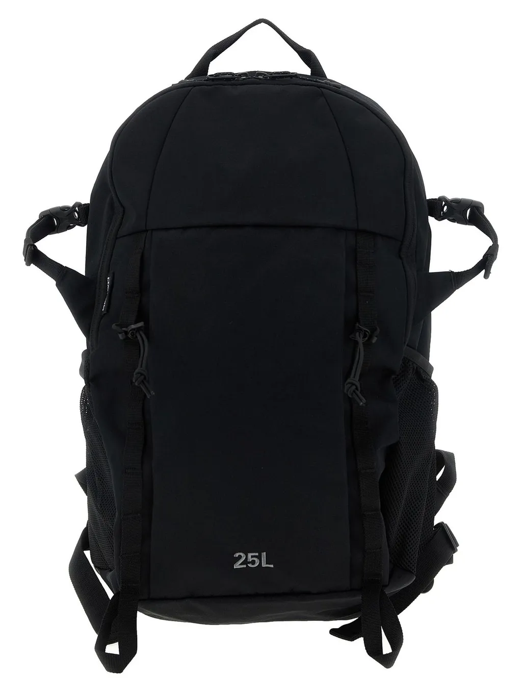 Recycled polyester backpack in black. Features adjustable shoulder straps and a top handle. Includes mesh side pockets and adjustable side straps.