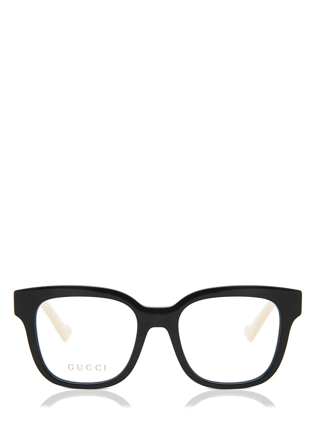 Black acetate rectangular frame glasses with beige temples. The gucci logo is visible on the left lens.