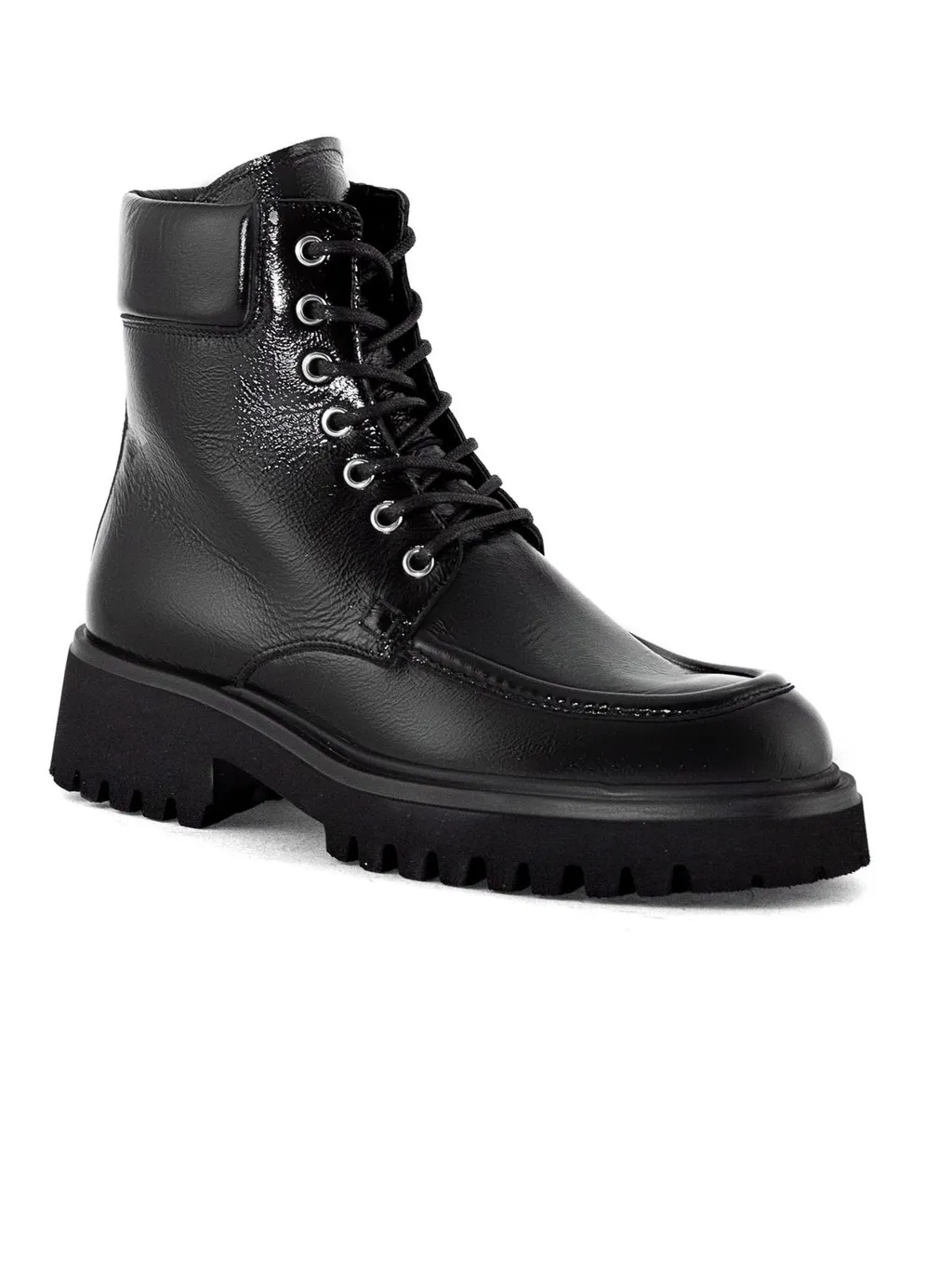 Black patent leather lace-up boots with a chunky sole. Features a round toe, lace-up fastening, and a side zip closure.