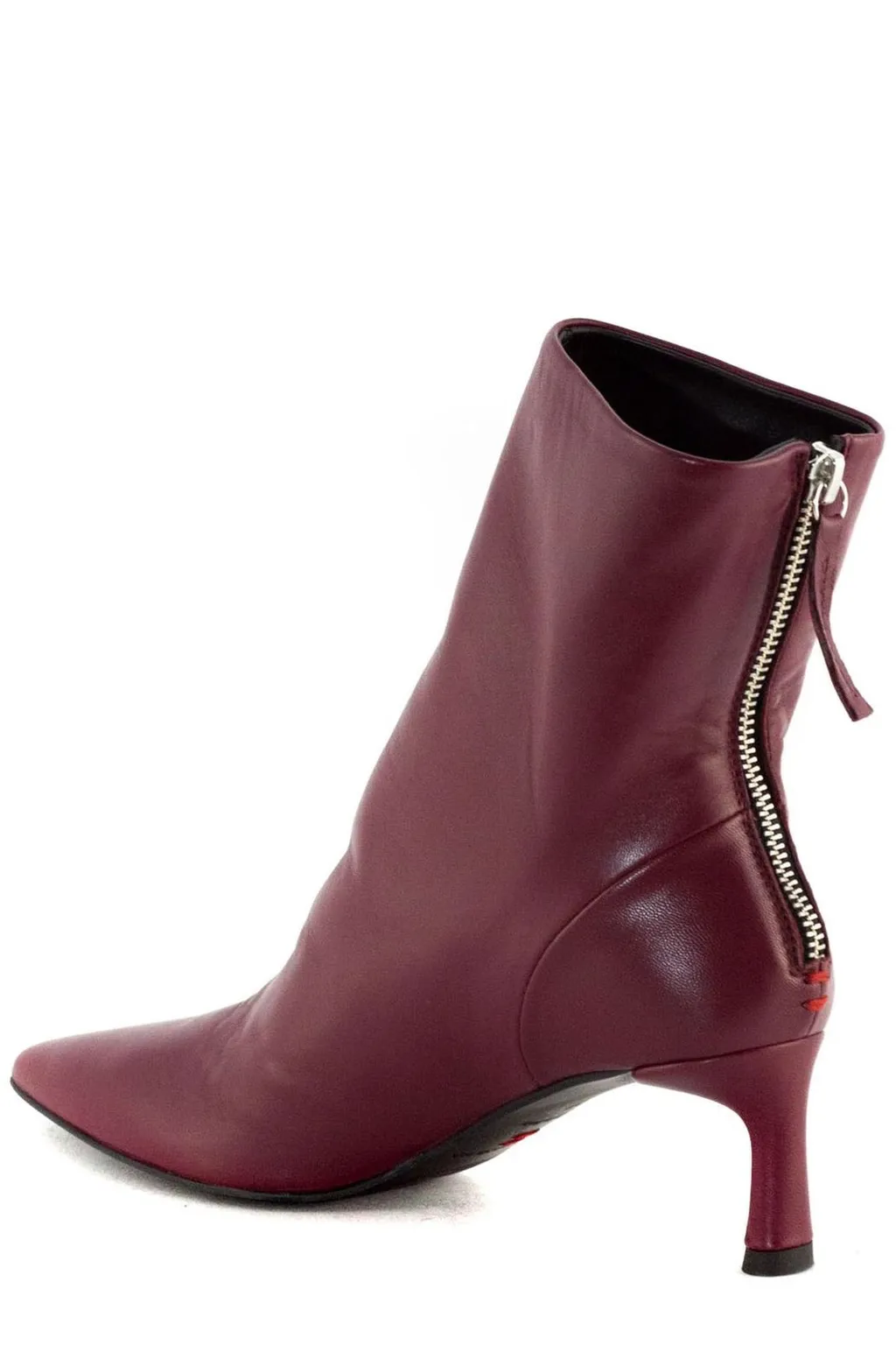 Pointed toe ankle boots with a kitten heel and a zipper closure at the back.