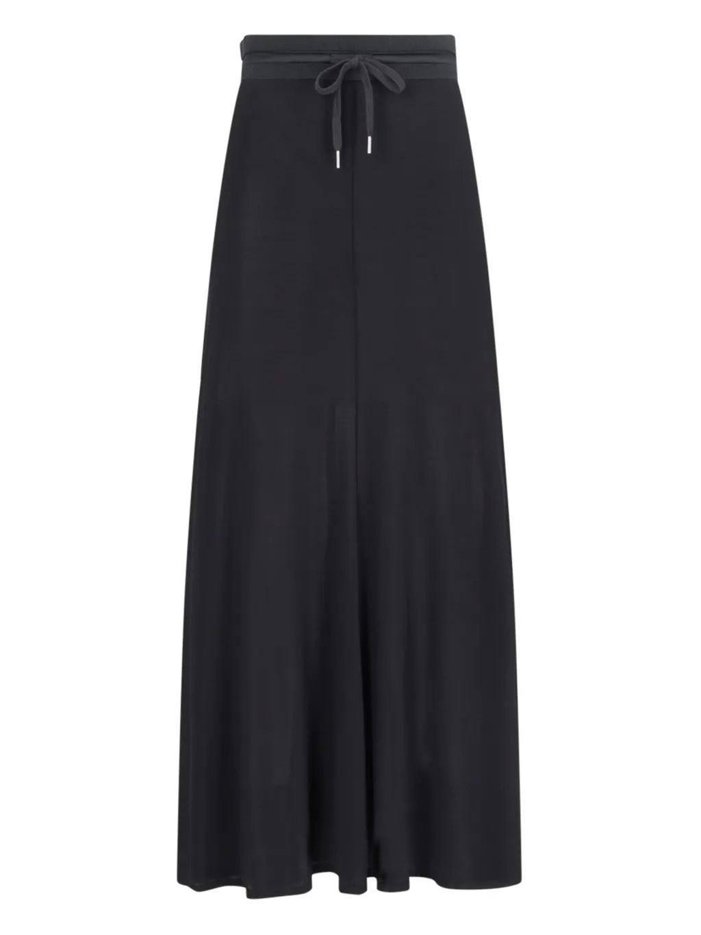 A floor-length black skirt with a drawstring waist and a subtle seam down the front. The fabric appears to be a lightweight, flowing material.
