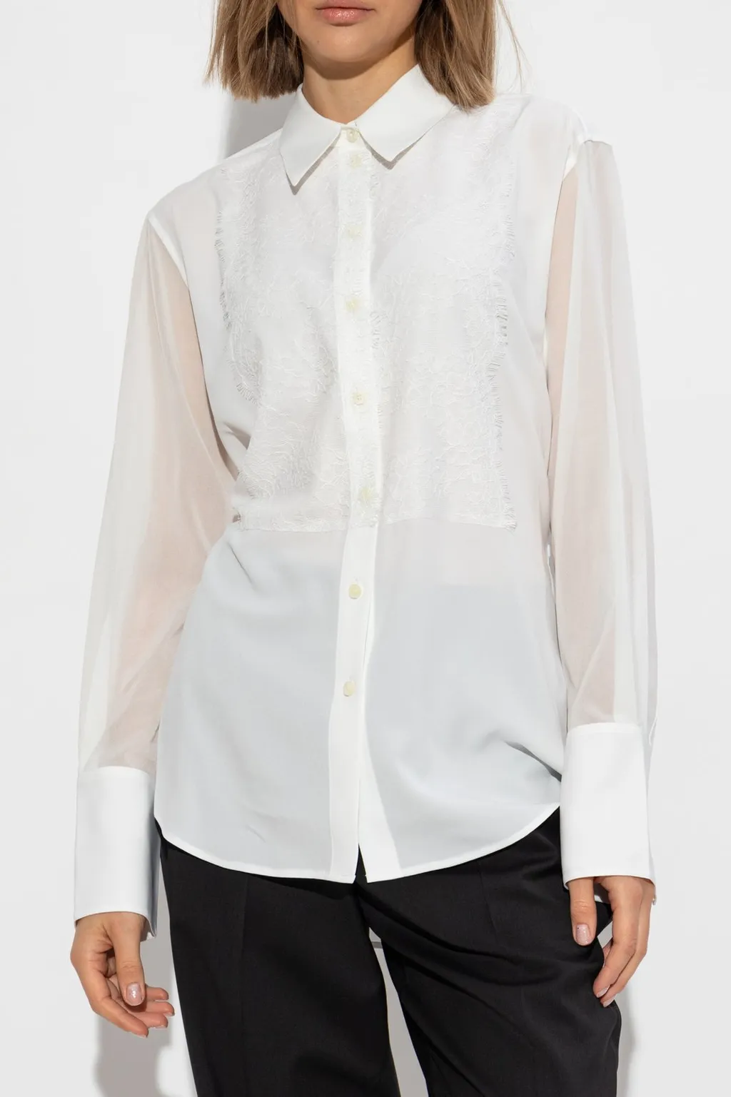A white long-sleeved shirt with a pointed collar and a button-down front. The upper chest features a lace panel with a raw edge detail. The cuffs are wide and buttoned. The shirt has a slightly sheer quality.