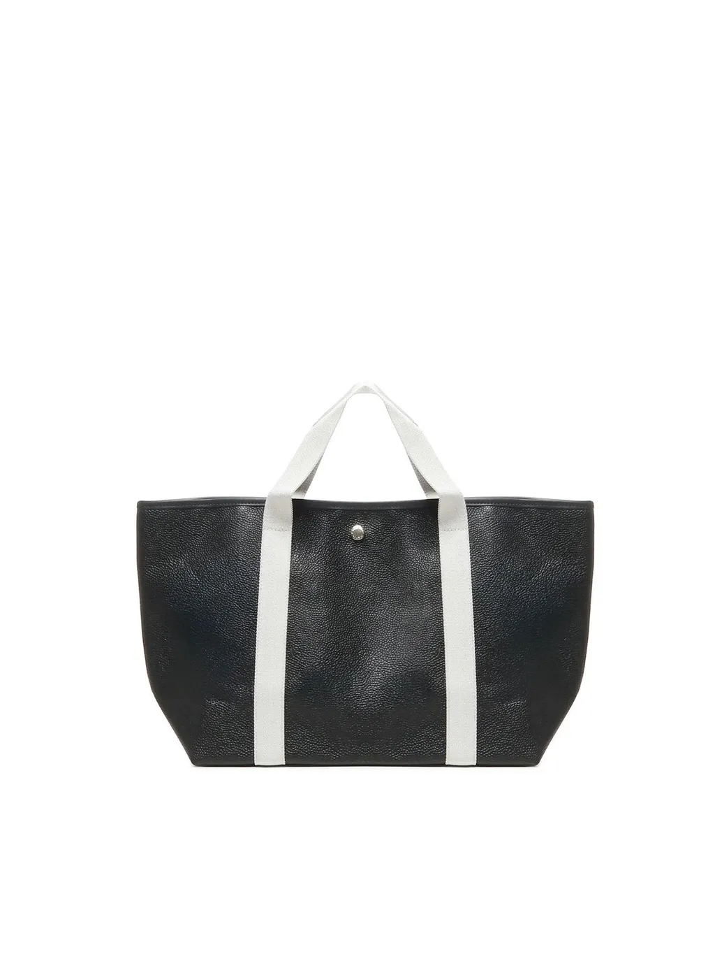 A black tote bag with two white top handles and a white stripe detail on the front. It has a snap closure at the top.