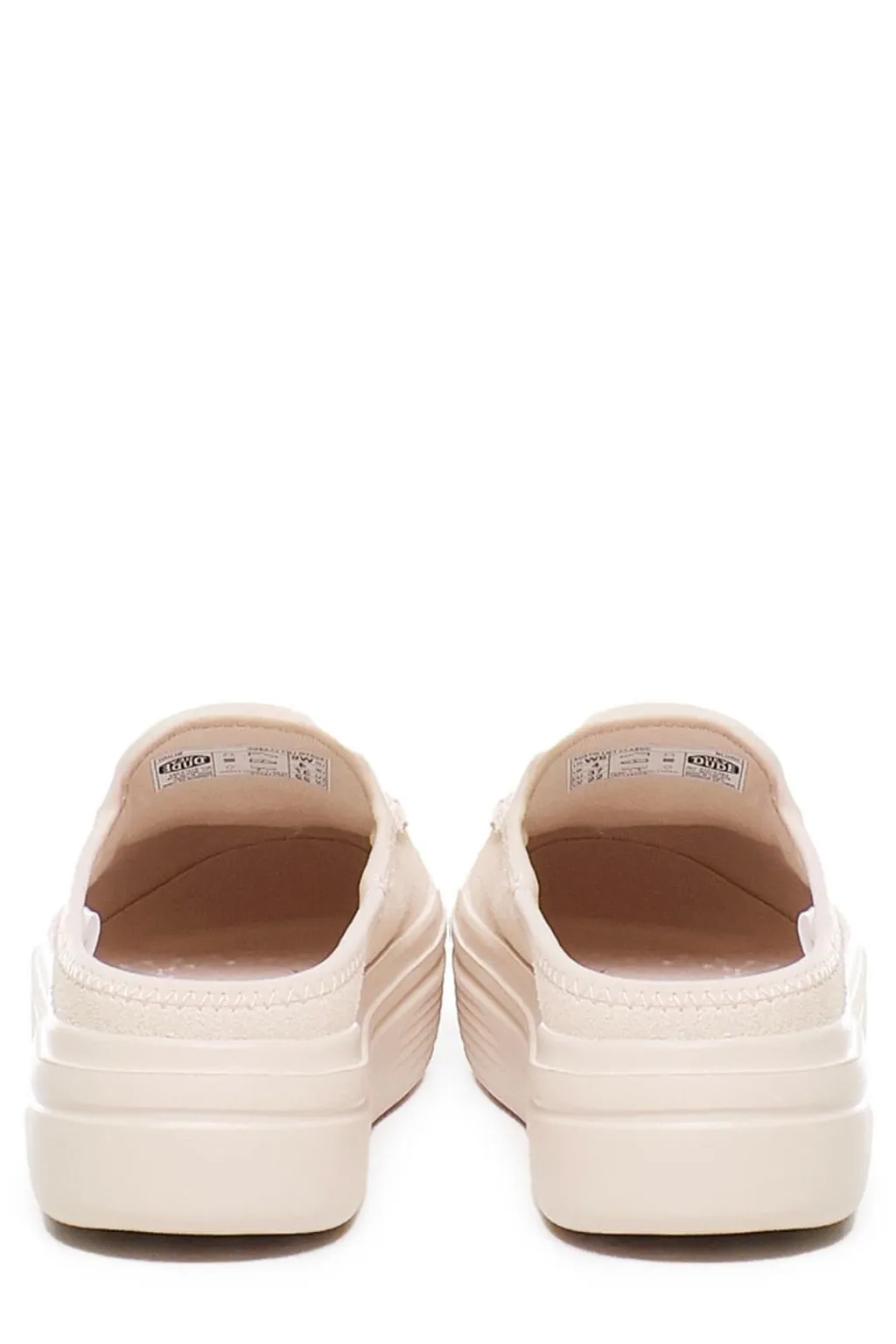 A pair of beige mule shoes with a rounded toe and a thick platform sole. The shoes have a slip-on design with a low-cut opening at the back.