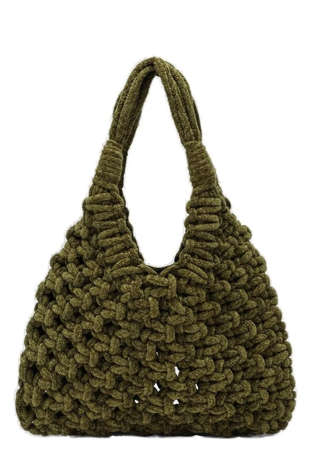A large, slouchy hobo bag with a chunky, knotted knit texture. It features two braided handles and an open top. The bag has a relaxed, bohemian aesthetic.