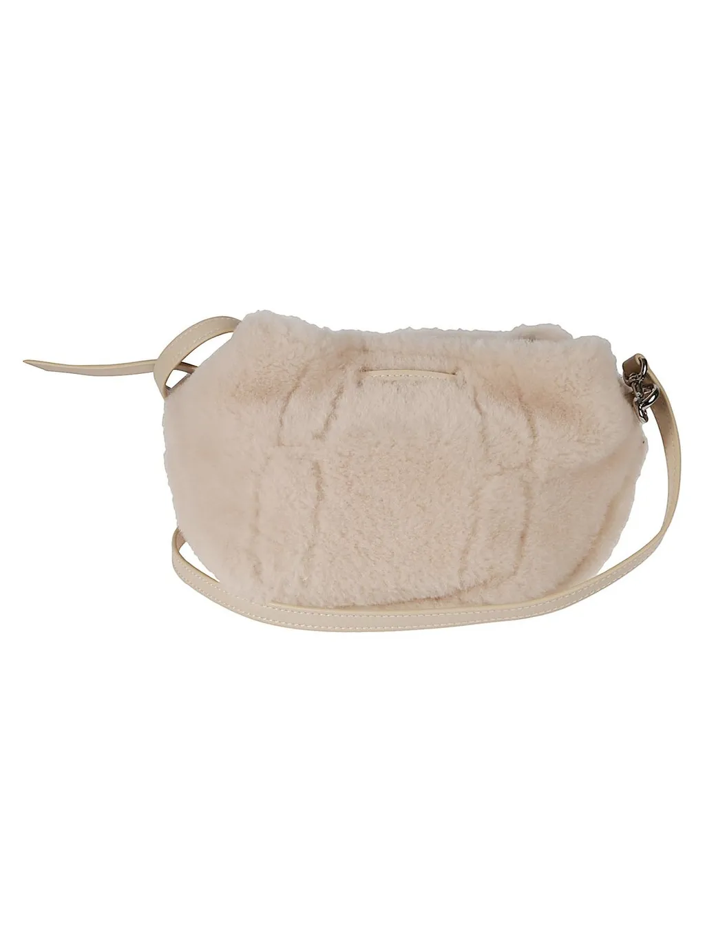 A small, soft bucket bag made of fluffy faux fur. It features a drawstring closure with two tassels and a single adjustable shoulder strap. The bag has a curved, rounded shape and a subtle quilted pattern on the front.