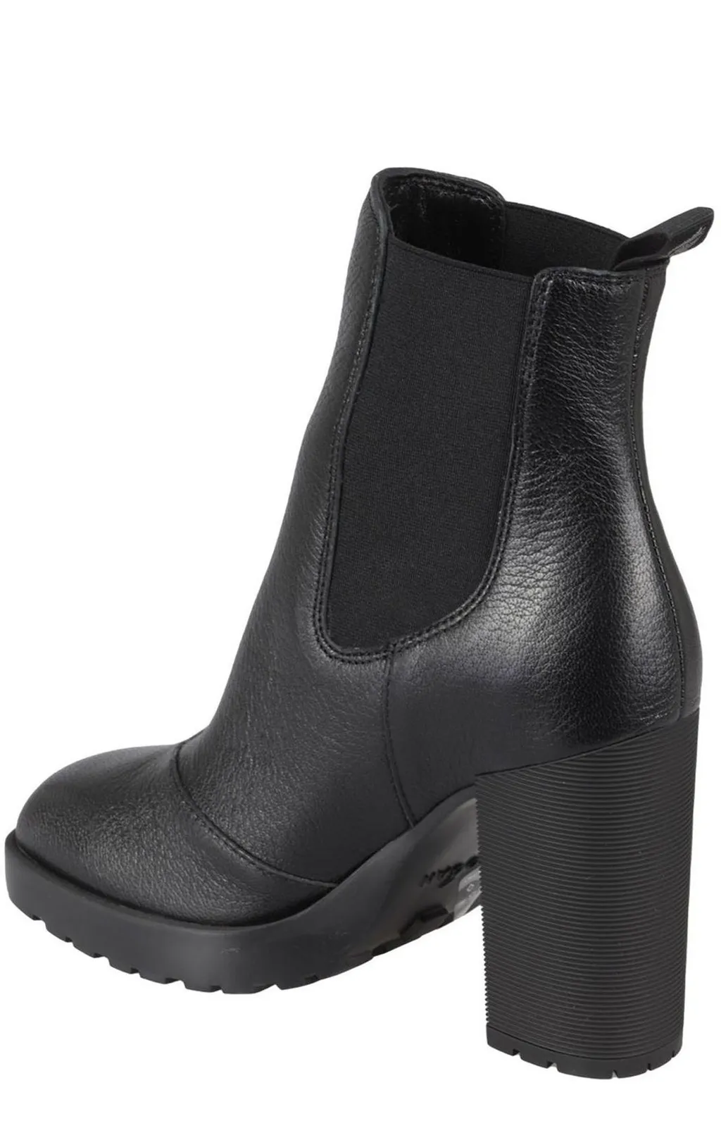 Black leather chelsea boots with a chunky platform sole and block heel. Features elasticated side panels and a pull tab at the back.