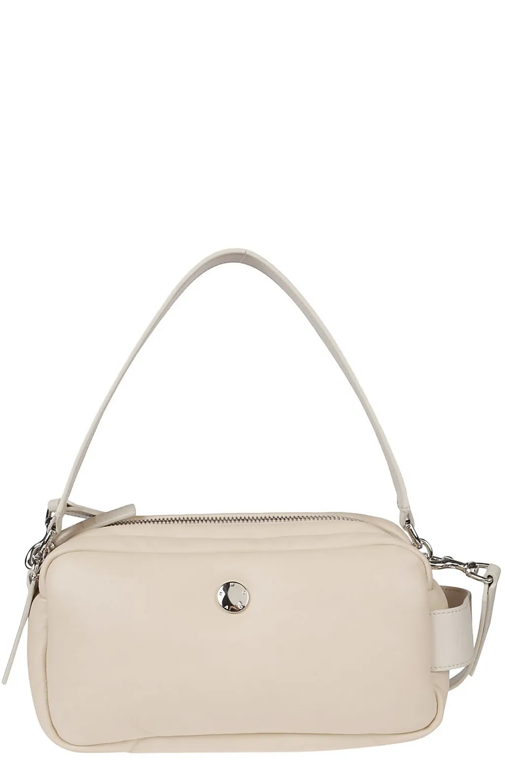 A white crossbody bag with a single top handle and an adjustable shoulder strap. It features a zipper closure and a small, circular metallic accent on the front.