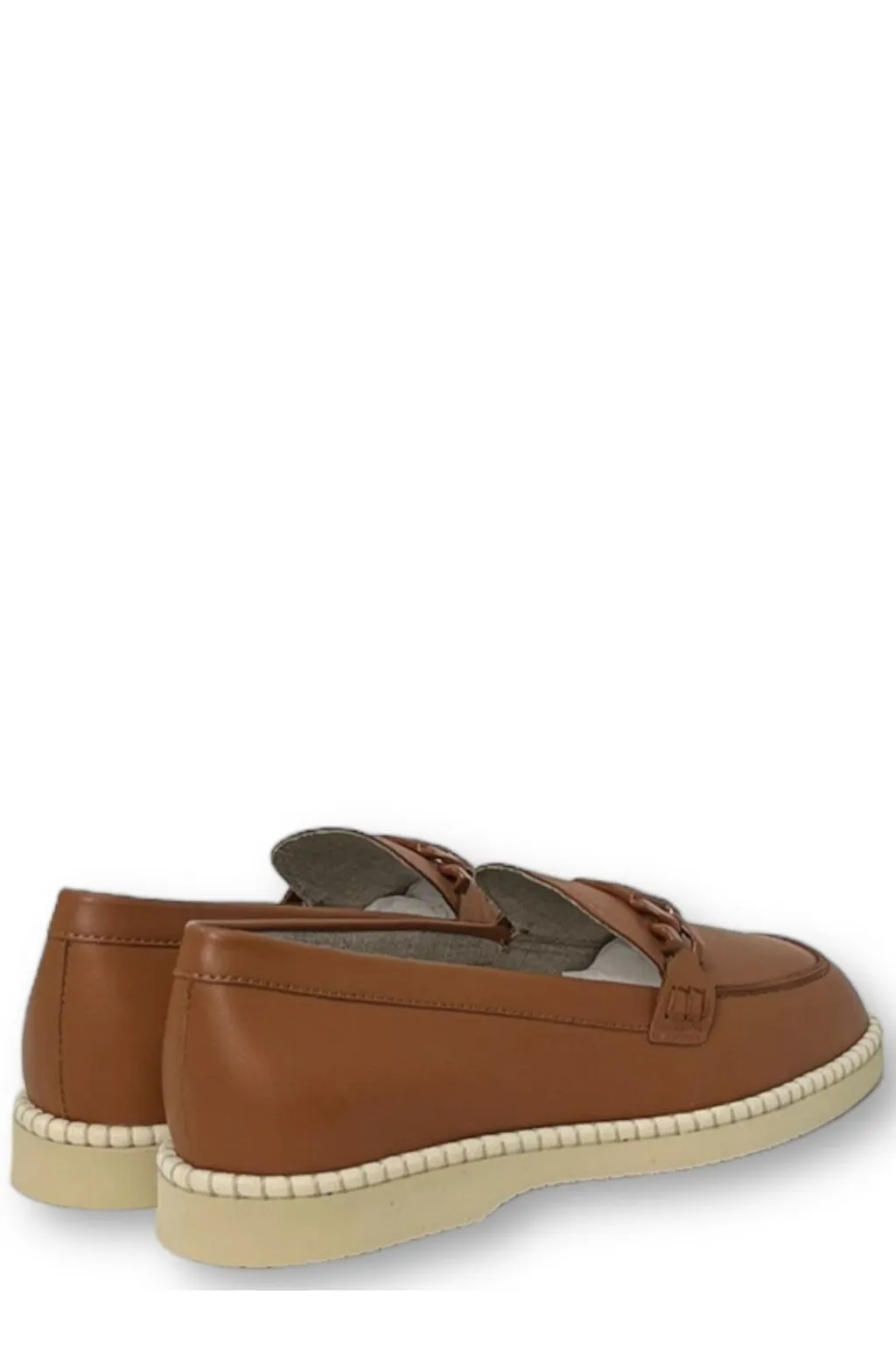 Classic brown leather loafers with a decorative chain detail across the vamp. They feature a round toe and a contrasting light-colored sole with visible stitching around the edge.
