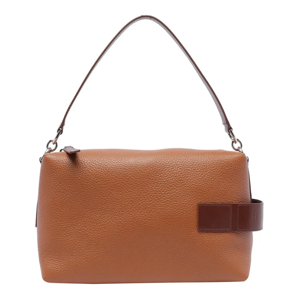 A brown leather shoulder bag with a single strap and a buckle detail on the side. The bag has a rectangular shape and a zip closure.