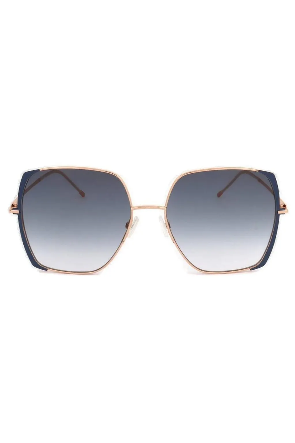 Oversized square sunglasses with a gold metal frame and blue acetate accents on the top corners. The lenses are a gradient grey.