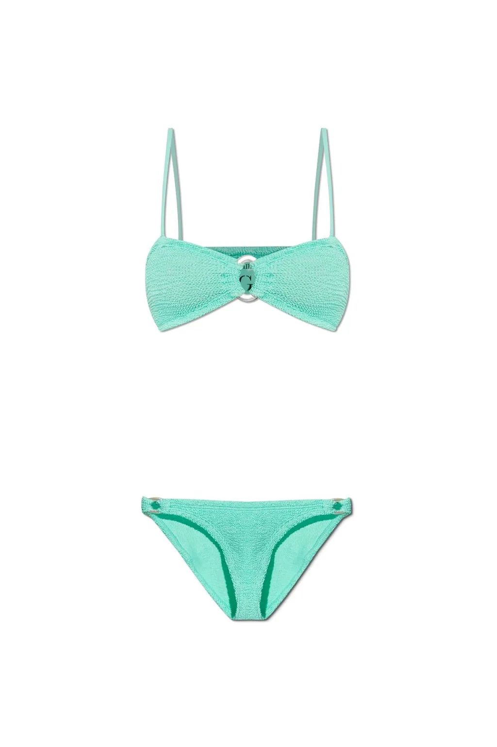 A two-piece bikini set featuring a textured fabrication. The top is a bandeau style with adjustable spaghetti straps and a ring detail at the center bust. The bikini bottoms are a classic triangle cut with adjustable side ties.