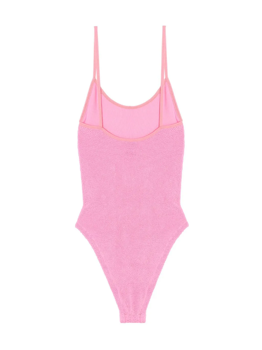 A textured one-piece swimsuit with thin spaghetti straps and a scoop neckline. The high-cut leg and low back provide a flattering silhouette.