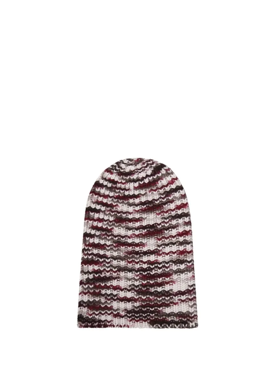 A knit beanie with a multicolored, wavy stripe pattern. The beanie has a rounded crown and a cuffed hem.