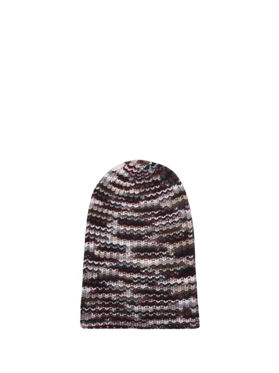 A knitted beanie with a multicolored, wavy stripe pattern. The beanie has a rounded top and appears to be made of a soft yarn.
