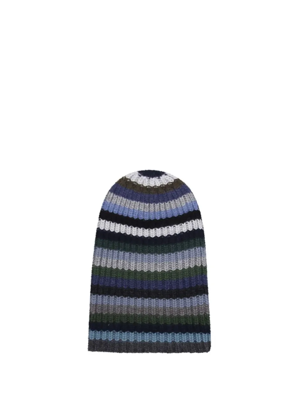 A ribbed knit beanie with a multicolored striped pattern. The beanie has a rounded top and a close-fitting silhouette.