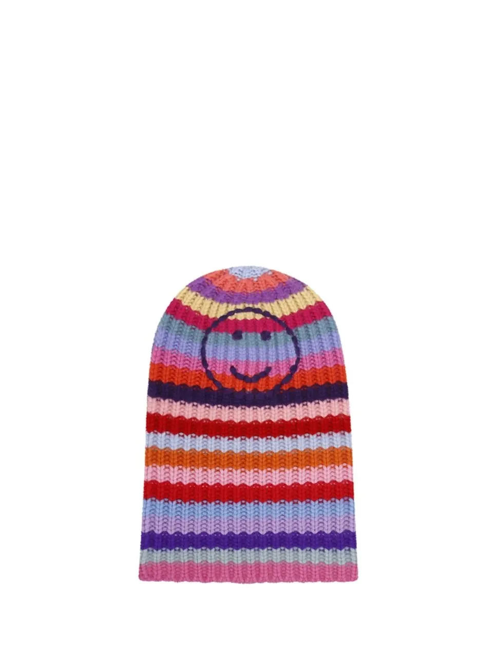A knit balaclava featuring a multicolored striped pattern and a smiley face graphic on the front. The balaclava covers the head and neck, with an opening for the eyes.