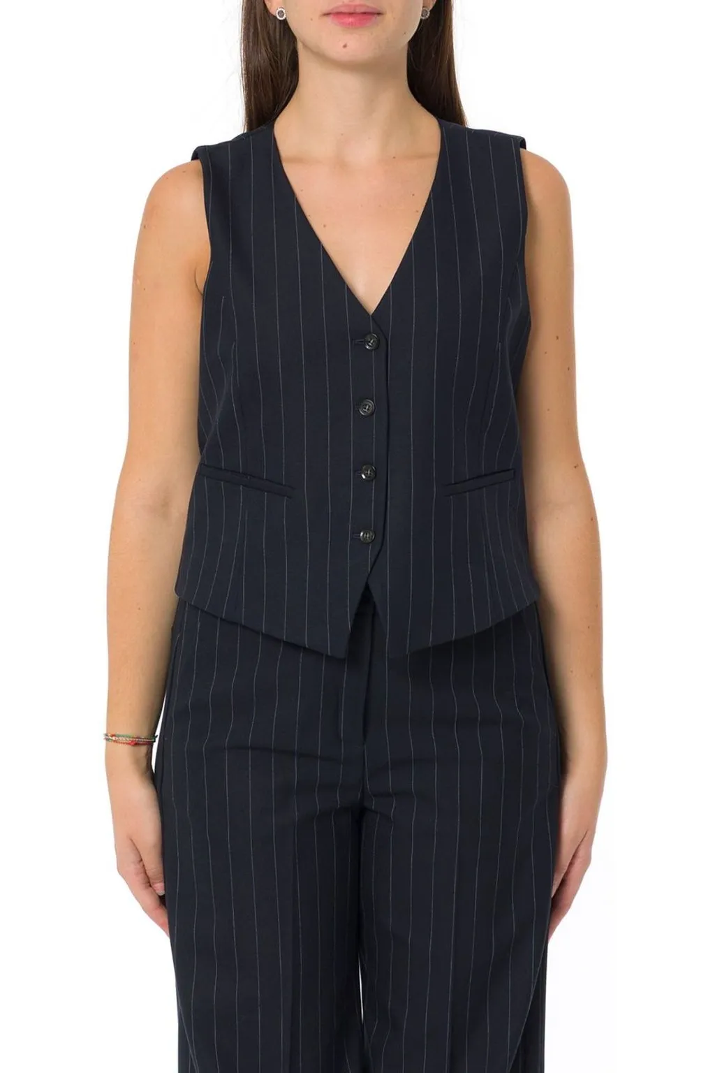 A classic pinstripe vest with a v-neckline and button-front closure. It features a tailored fit with two welt pockets at the front and an adjustable strap at the back for a customized fit. The vest is sleeveless.