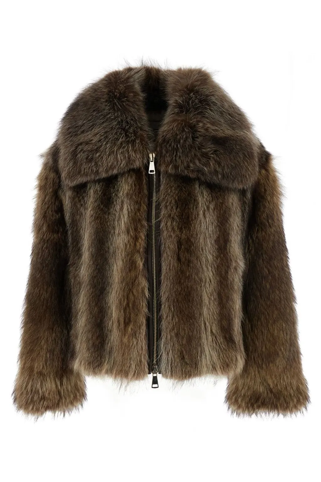 A brown fur jacket with a wide collar and a zipper closure. The jacket has long sleeves and a straight hem.