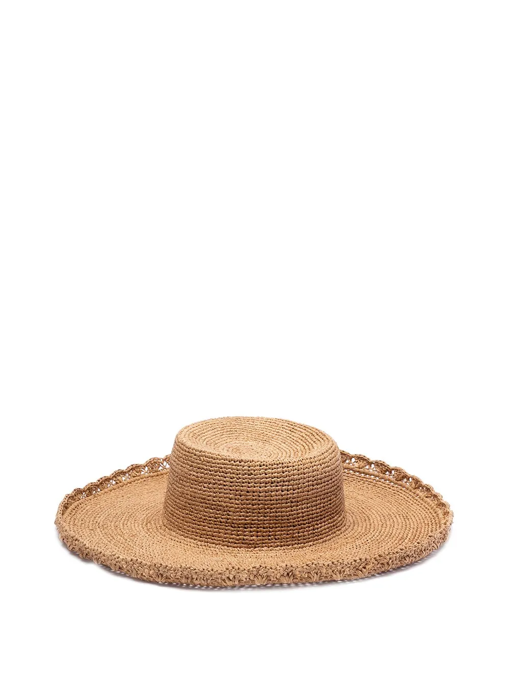 A wide-brimmed straw hat with a rounded crown and a decorative, crocheted edge. The hat is made of woven straw, giving it a natural and textured appearance.