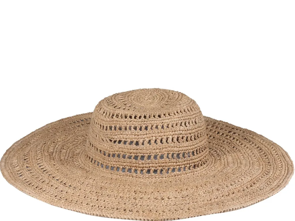 A wide-brimmed straw hat with a woven texture. The crown and brim feature an open-knit pattern, allowing for breathability. This hat offers significant sun protection.