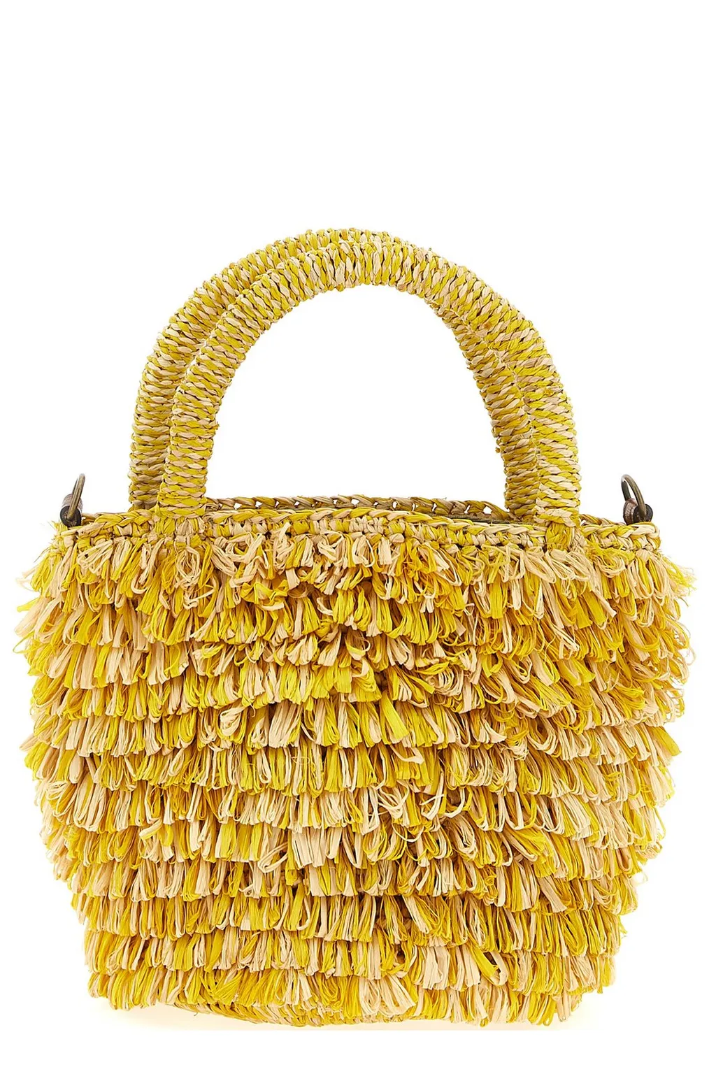 A small tote bag made of woven straw with a fringe detail. It has two top handles and a detachable shoulder strap.
