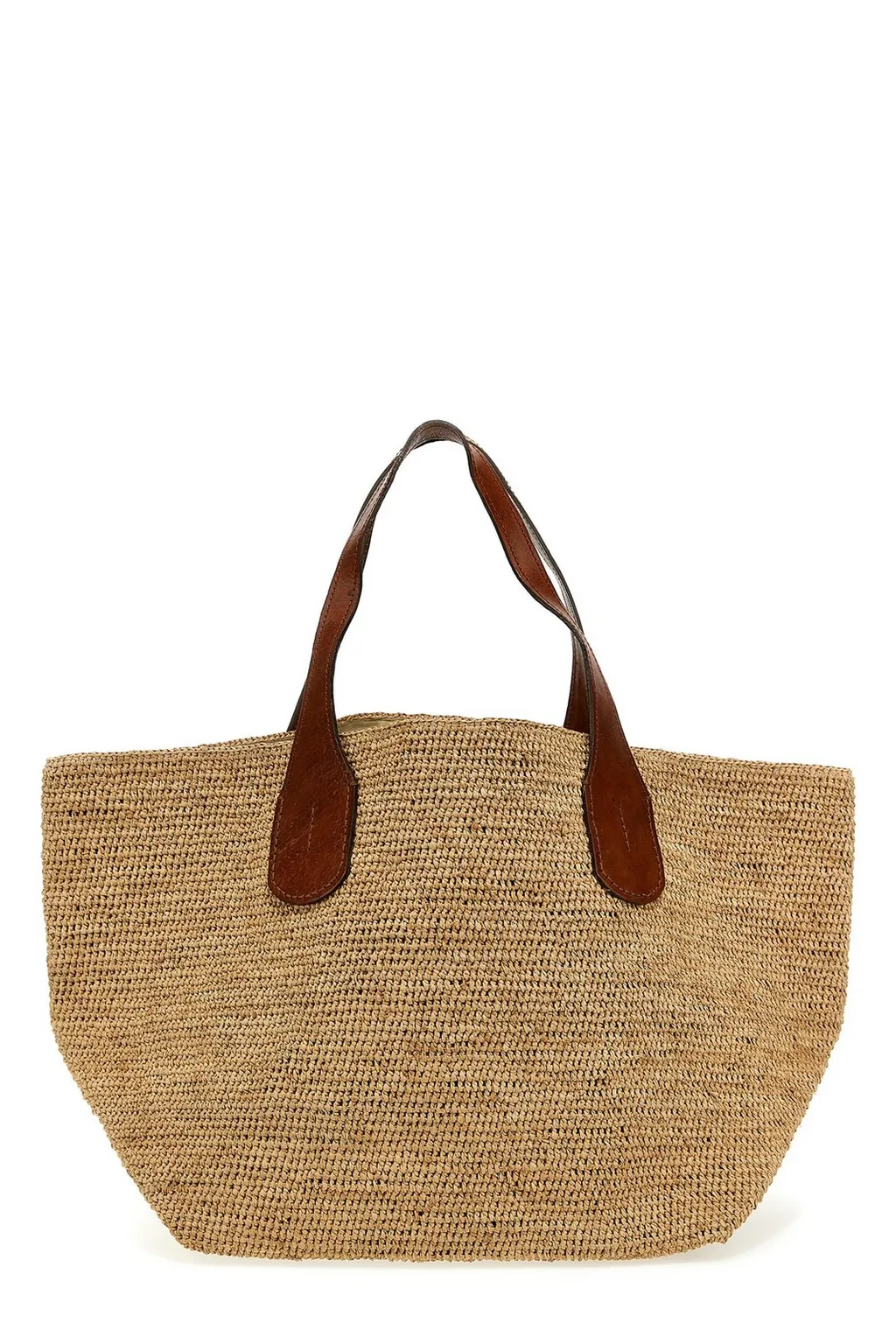 A large, open-top tote bag with two brown leather handles. The bag is made of a woven, straw-like material in a natural beige color.