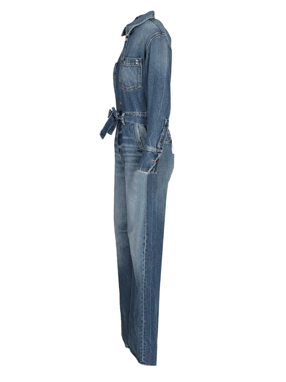 A long-sleeved denim jumpsuit featuring a collared neckline, button-down front, and a self-tie belt at the waist. The jumpsuit has a wide-leg silhouette and a faded wash.