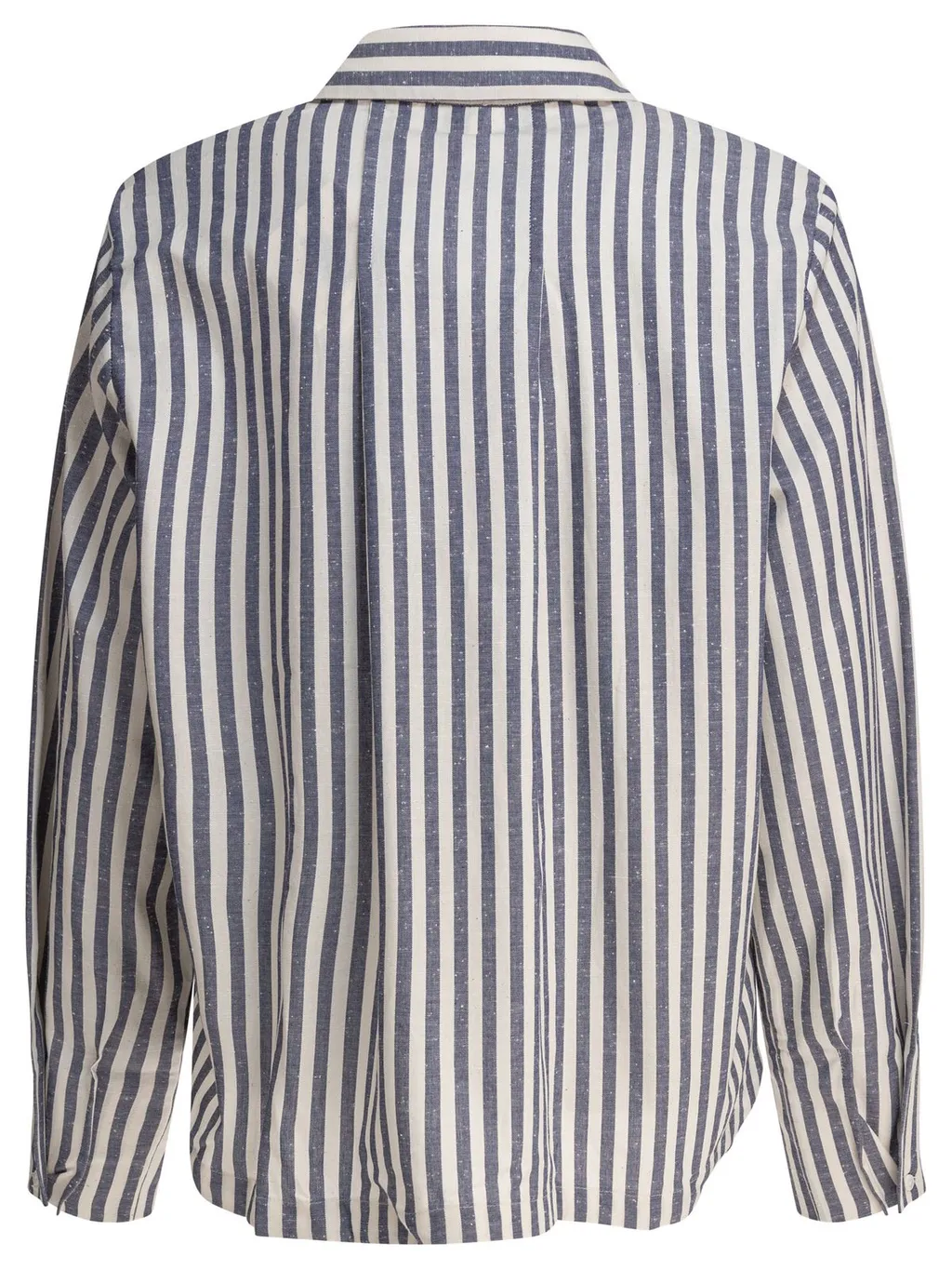 A long-sleeved popover shirt with a classic collar and a vertical stripe pattern. The shirt features a relaxed fit and a buttonless placket.
